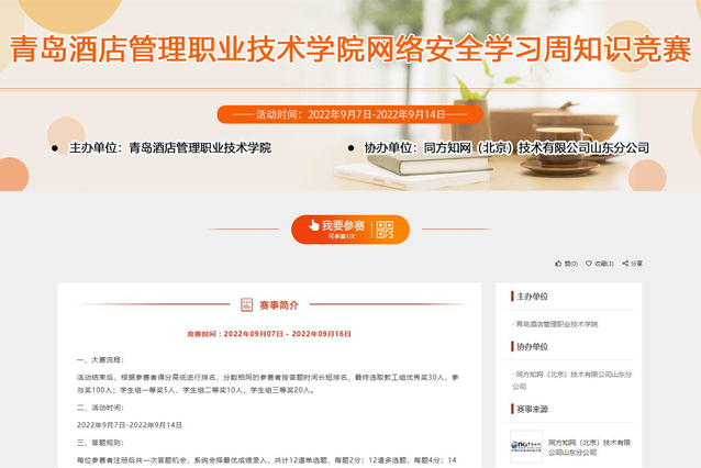 活动期间,学校通过官方网站、官方微信公众号、校园广播电台、横幅、海报等媒介,全方位宣传网络安全政策法规、网络安全知识和个人信息保护、防诈骗相关内容,积极营造网络安全宣传周活动氛围。各二级学院以班级为单位,分别开展了网络安全主题班会,围绕网络行为安全、网络交易安全、网络交友安全等内容,引导学生严格遵守法律底线,自觉抵制网络不良信息。教育信息中心参加“2022年国家网络安全宣传周山东省校园日活动暨山东省教育网络安全创新发展论坛”并作典型经验分享,先后举办线上网络安全专题讲座和网络安全知识答题竞赛活动,普及数据安全法、个人信息保护法相关知识,增强师生安全防护意识。
